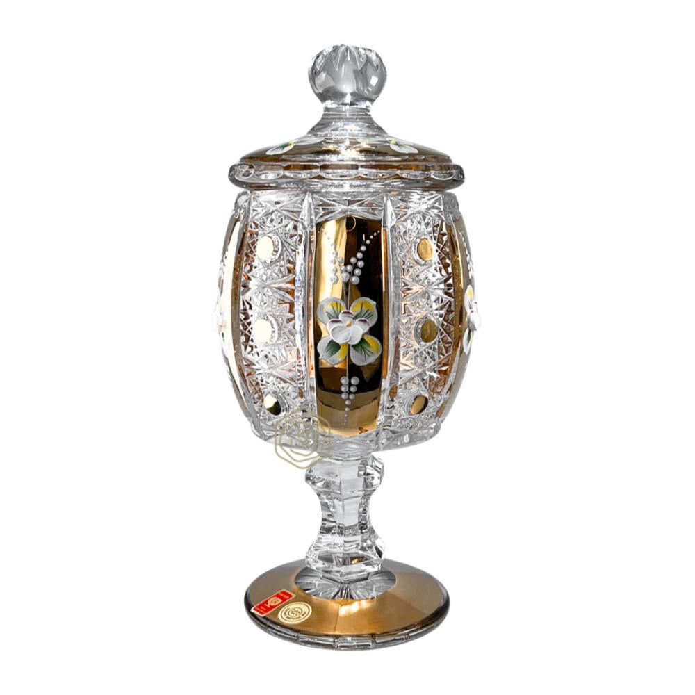 فازة كريستال بوهيمي ذهبية بقاعدة مرتفعة مع غطاء ( تصميم برميل ) | حجم صغير