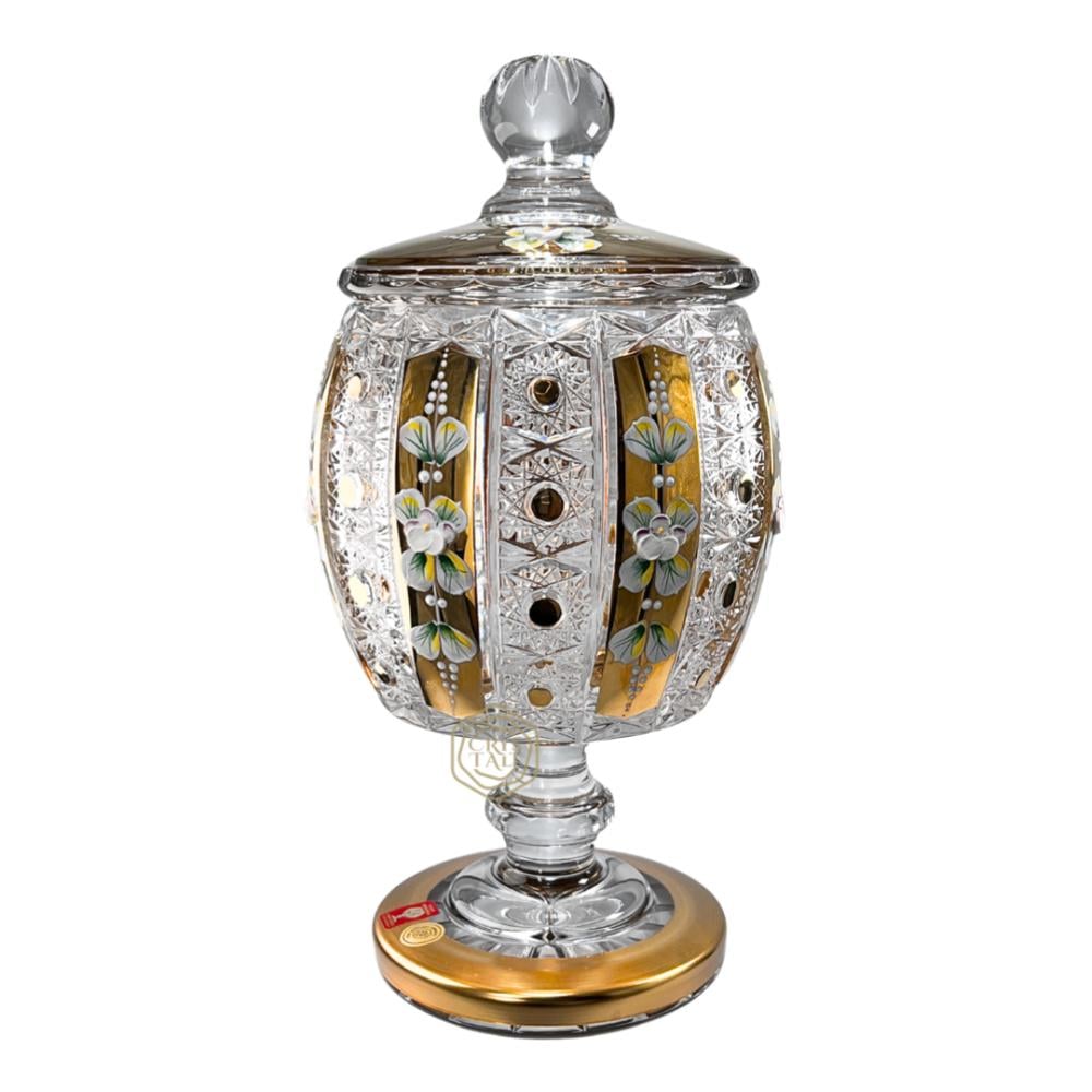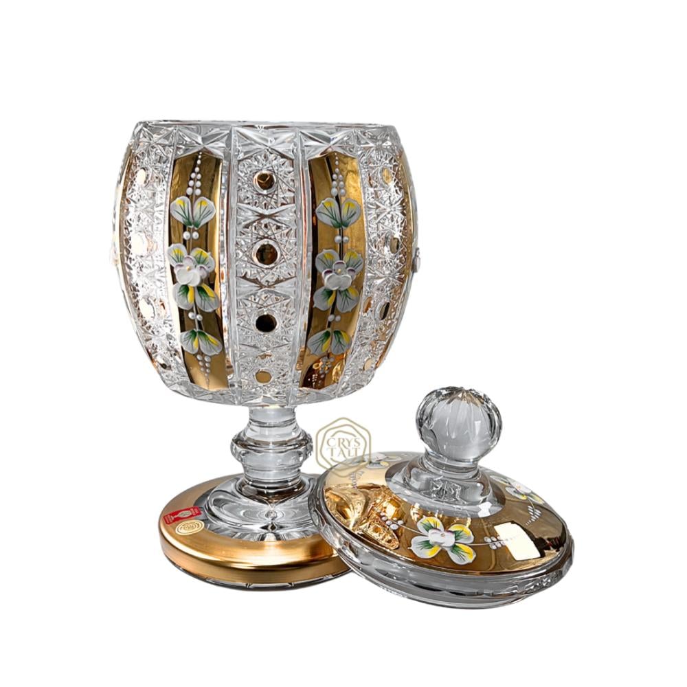 فازة كريستال بوهيمي ذهبية بقاعدة مرتفعة مع غطاء ( تصميم برميل ) | حجم وسط